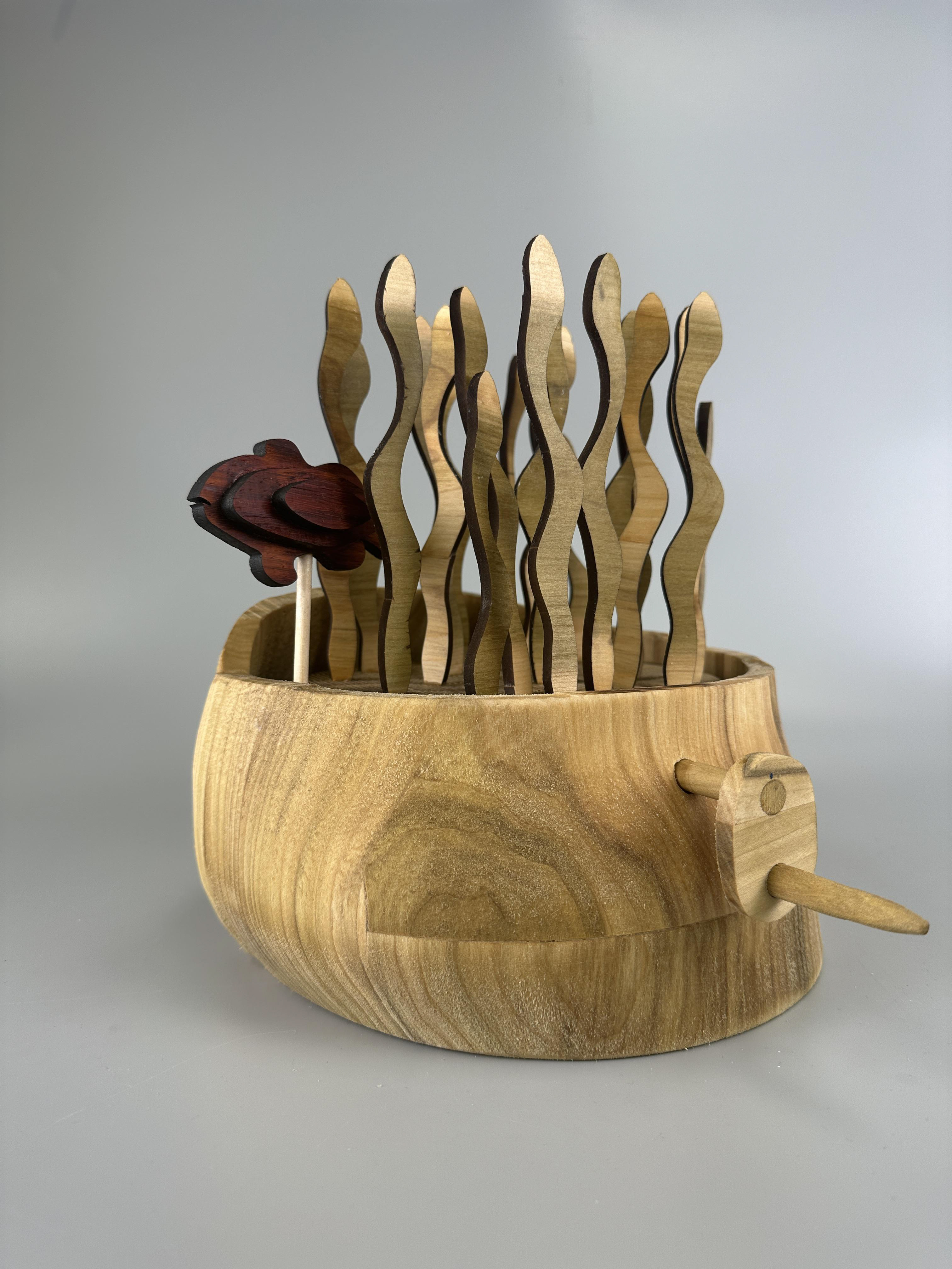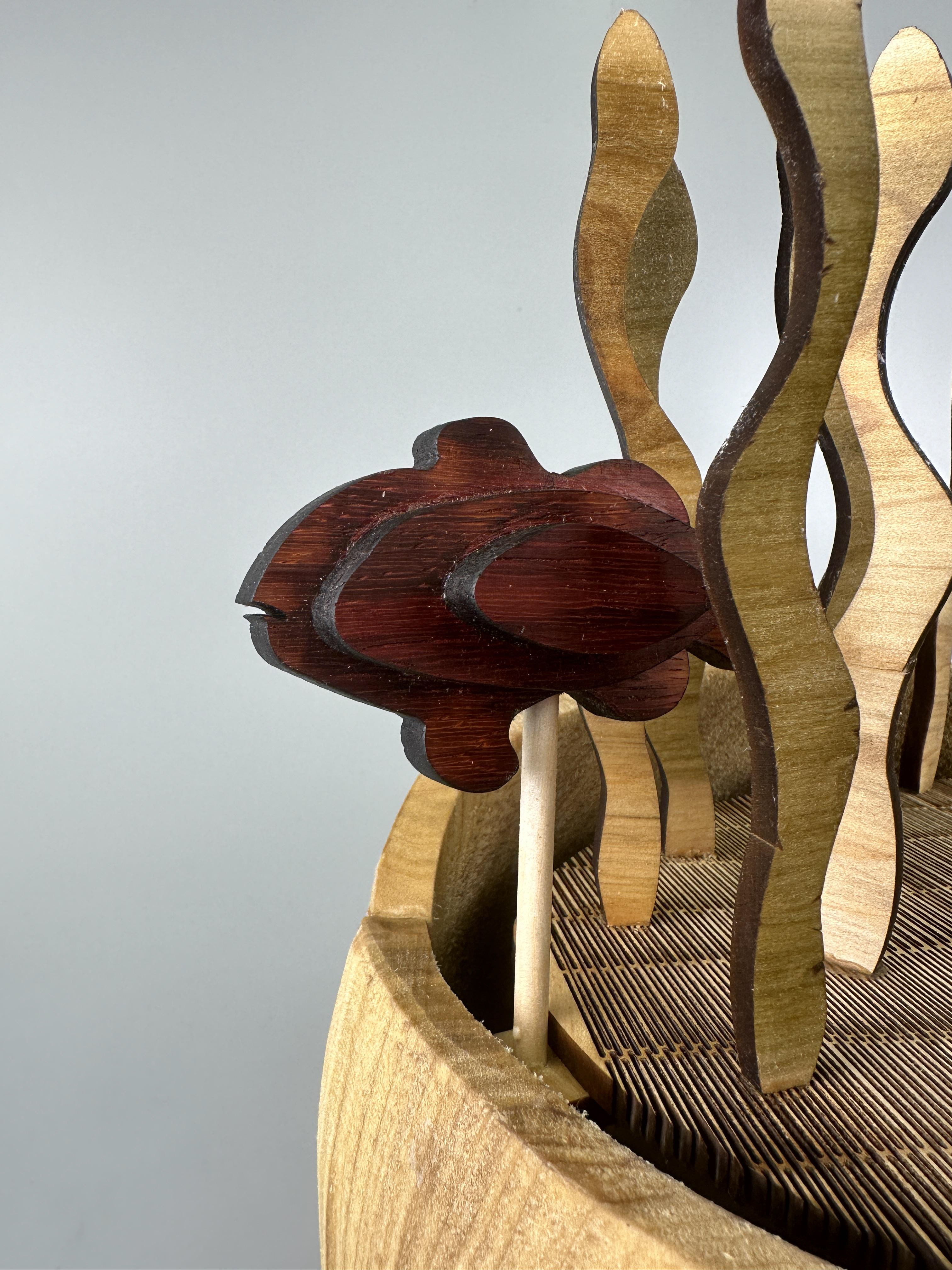 Once my mechanism and aesthetics were finalized, I began process work in the wood shop. I modeled the base in Fusion 360 so it could be cut using the CNC Router. All of my cams and anemone tentacles were laser cut, and I used the drill press to create holes.