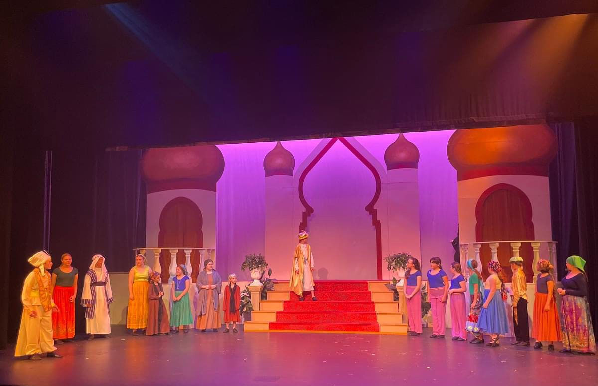 The main set piece was the Sultan's palace; it needed to be huge but upstage enough to allow for drops to fly in front of it so other scenes could take place.