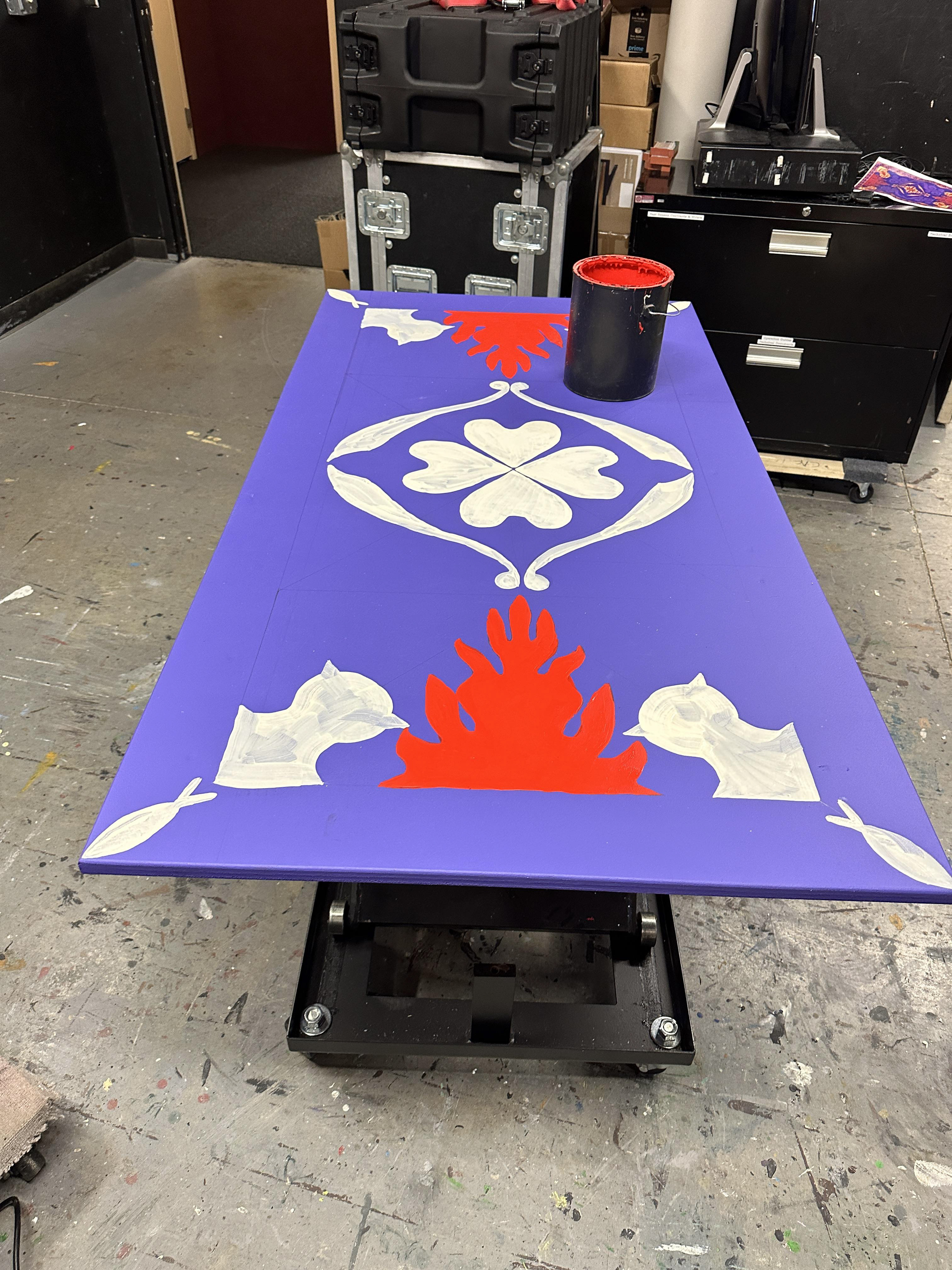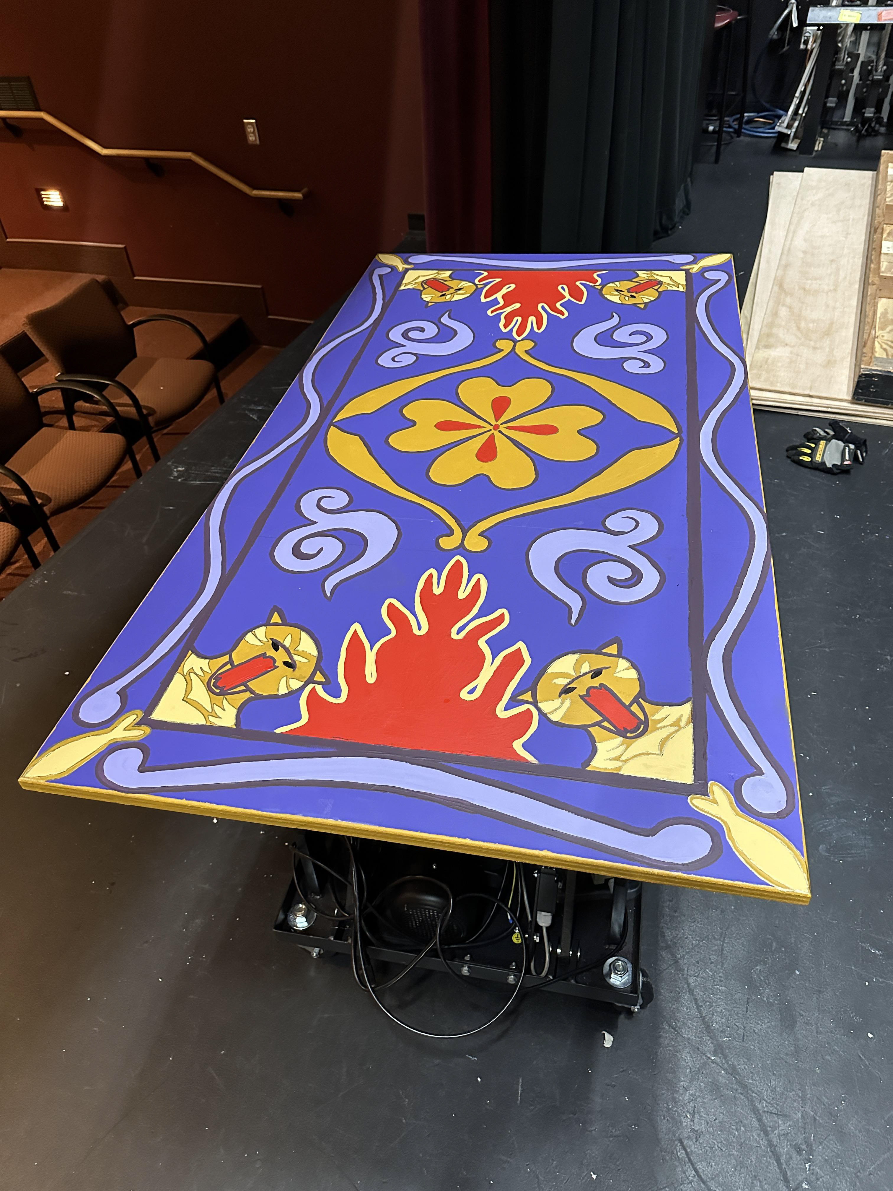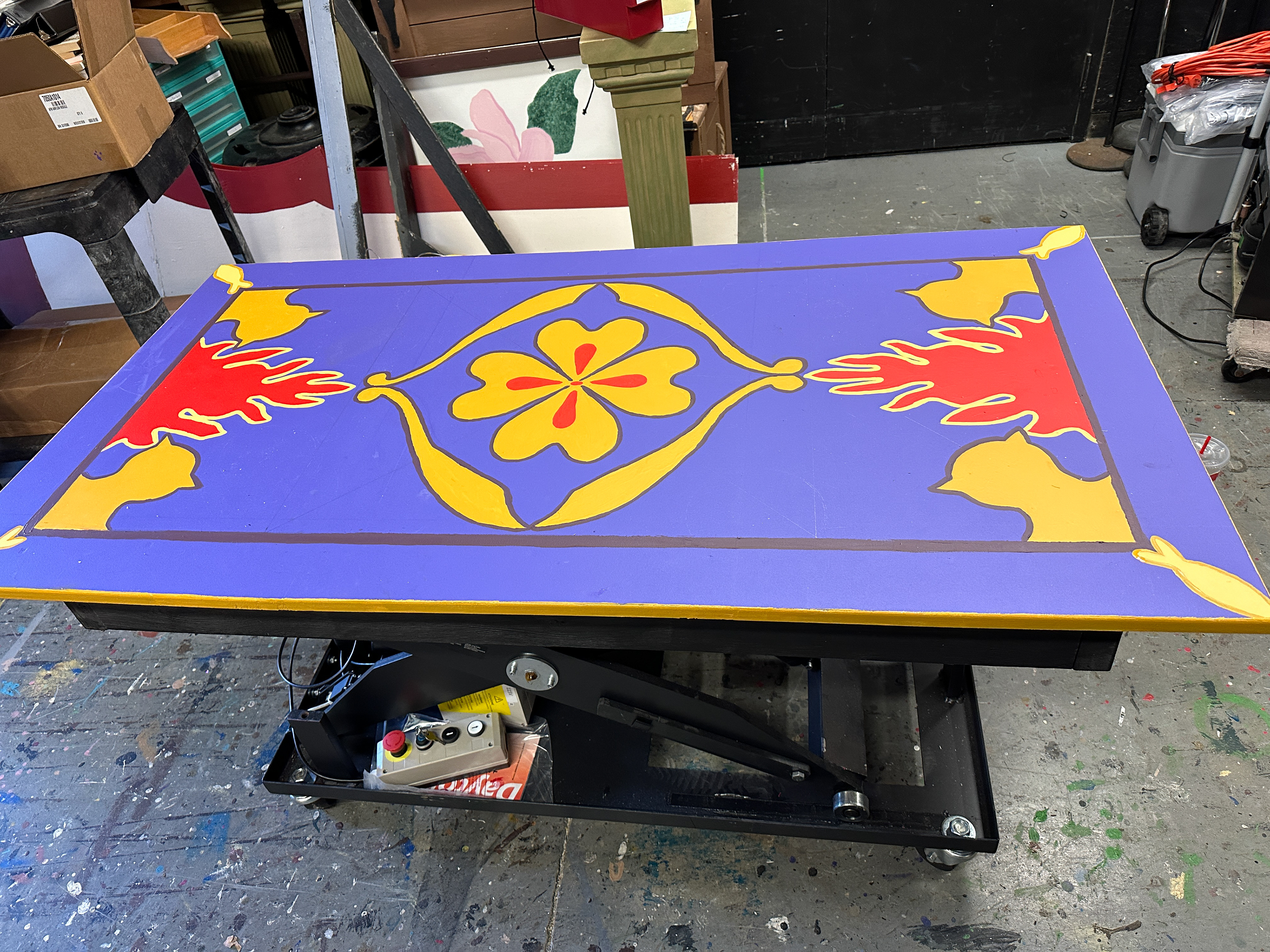 My boss and I worked together to assemble a hydraulic lift to work as the imperative magic carpet for the show, then it was my job to paint!