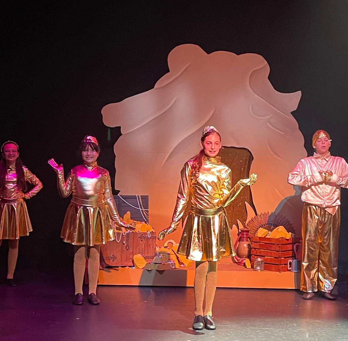 We wanted the piece to be able to turn around for the following scene, so I painted and dressed the back to be the inside of the cave, sandy and full of gold treasures. Another constraint was that we needed the piece to be light enough so that the children in the show could make the scene change themselves, so I used foam as gold bricks and filler for the massive chests and crates.