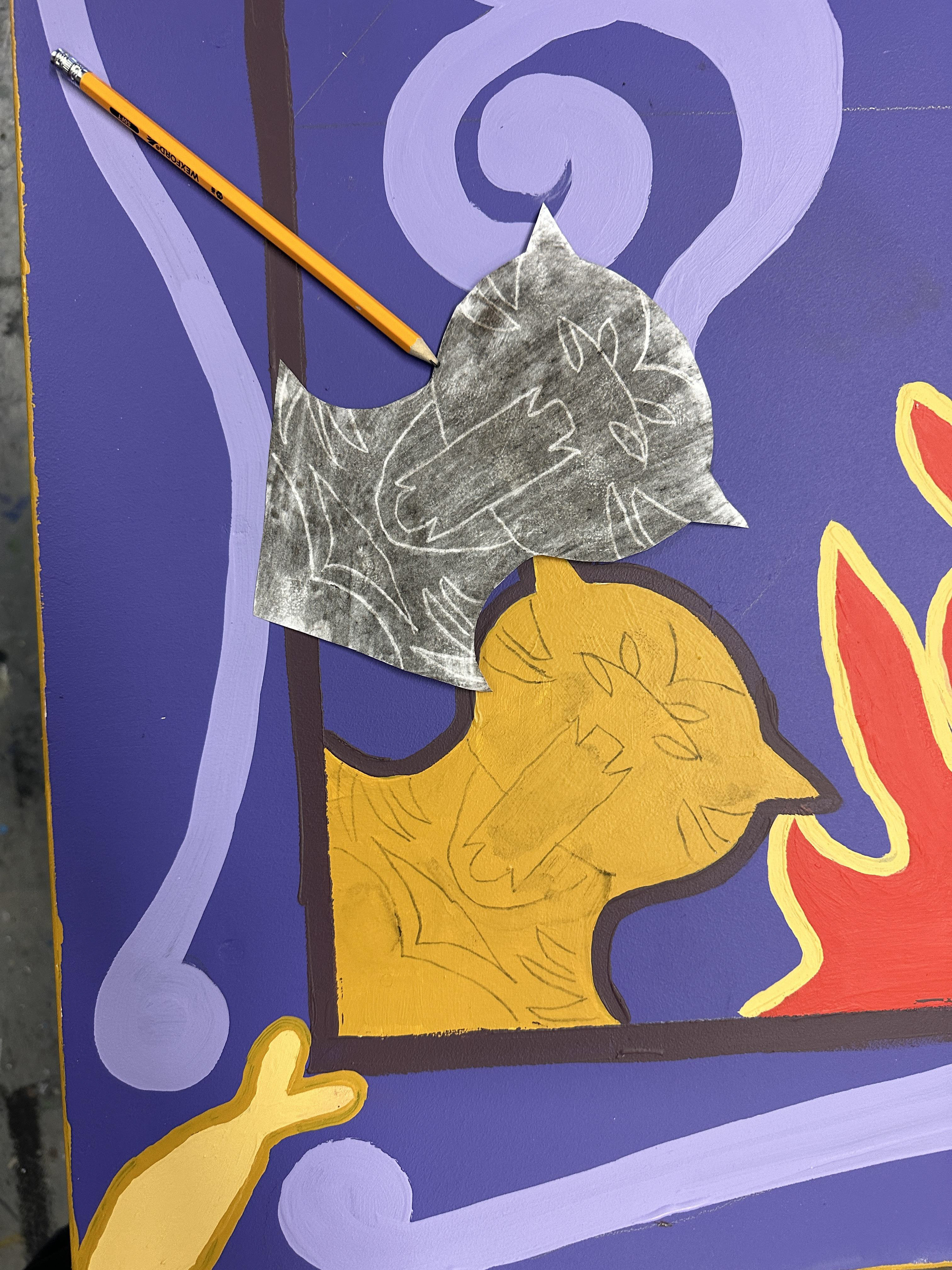 From there, I found an image I liked and sketched it on a piece of transparent paper so I could project it onto two stacked 4'x8' panels and trace my sketch.