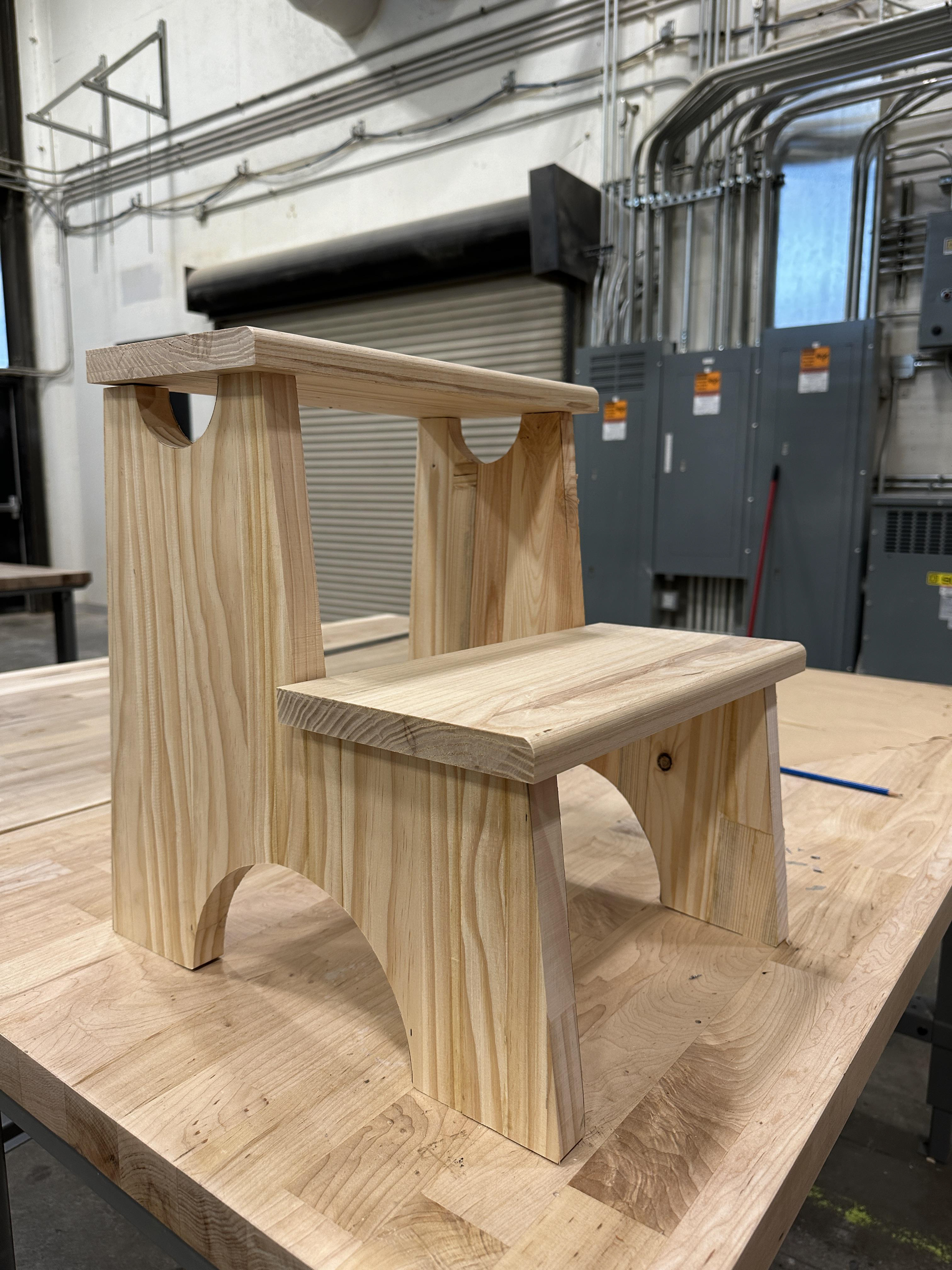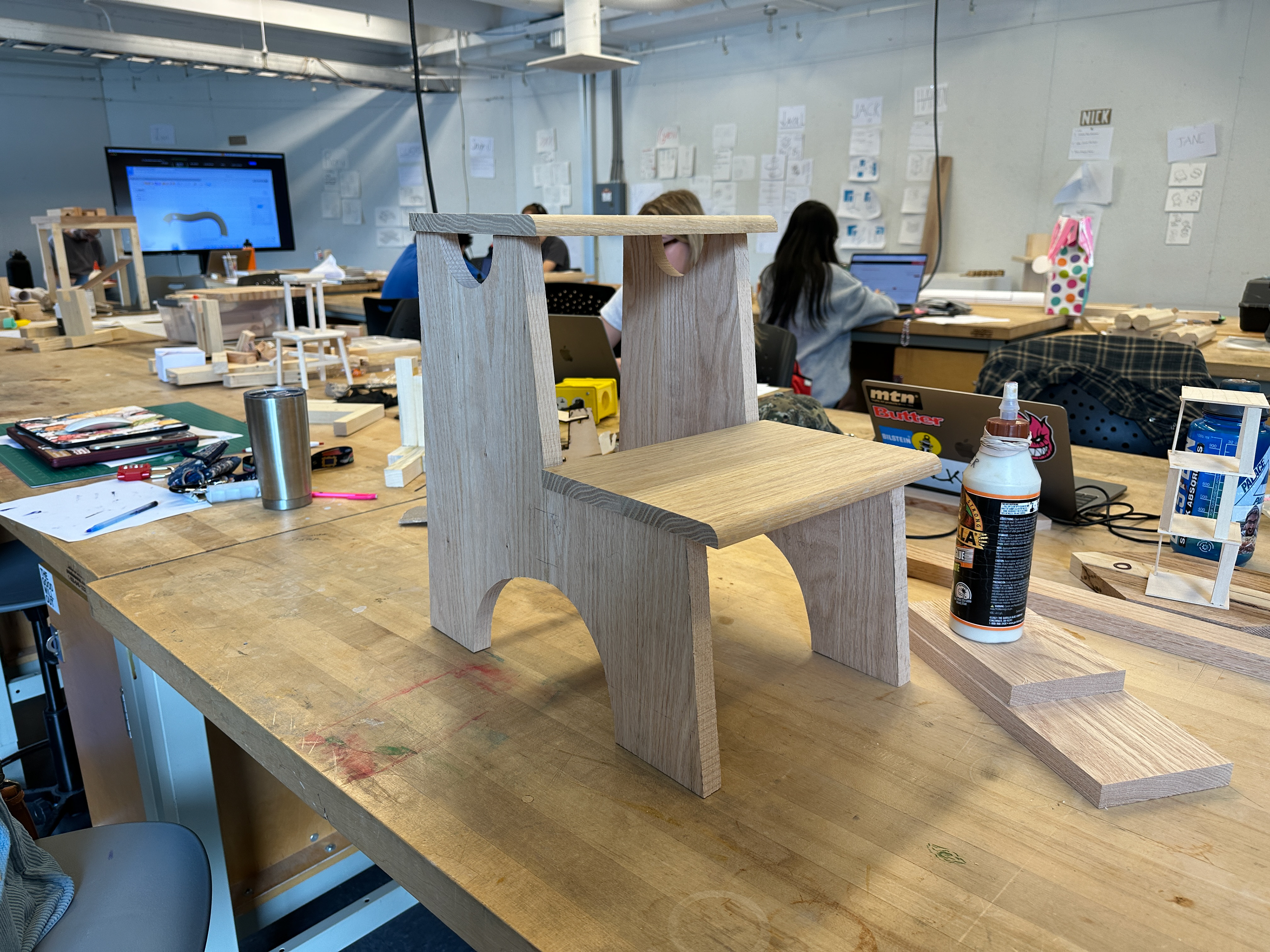 Using scrap wood, I made my first iteration model to practice my cuts and joinery techniques as well as refine any aesthetics. At this point, I only made one major change, going from three rungs to a singular one. The stability of the model stool was impressive, and my decision was solidified after testing and getting feedback.