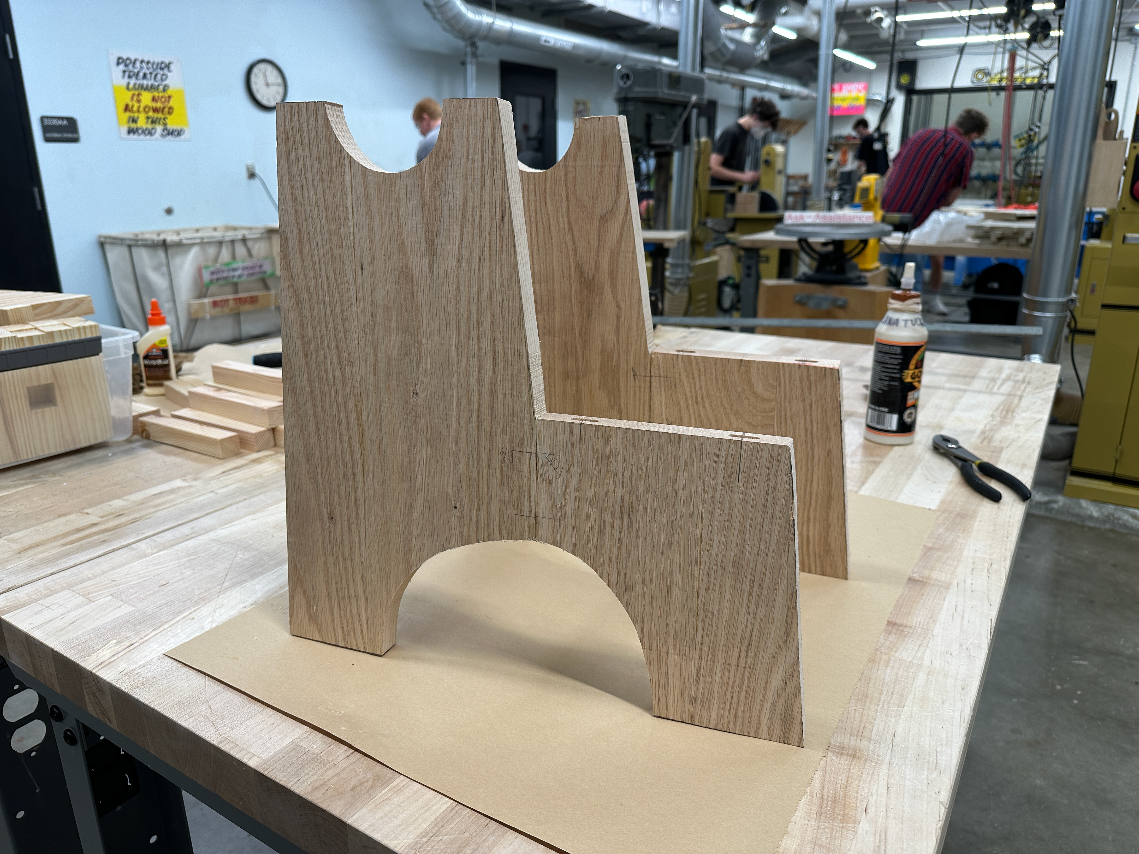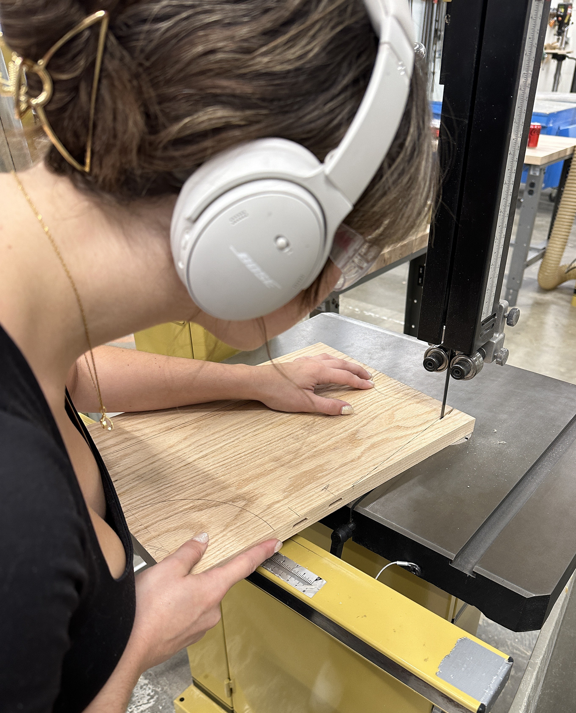 After joining, planing, and laminating my wood together, I got to work in the shop. I used several different machines, such as the chop saw and the band saw, to make my cuts. Then I used a domino tool for all of my joinery.