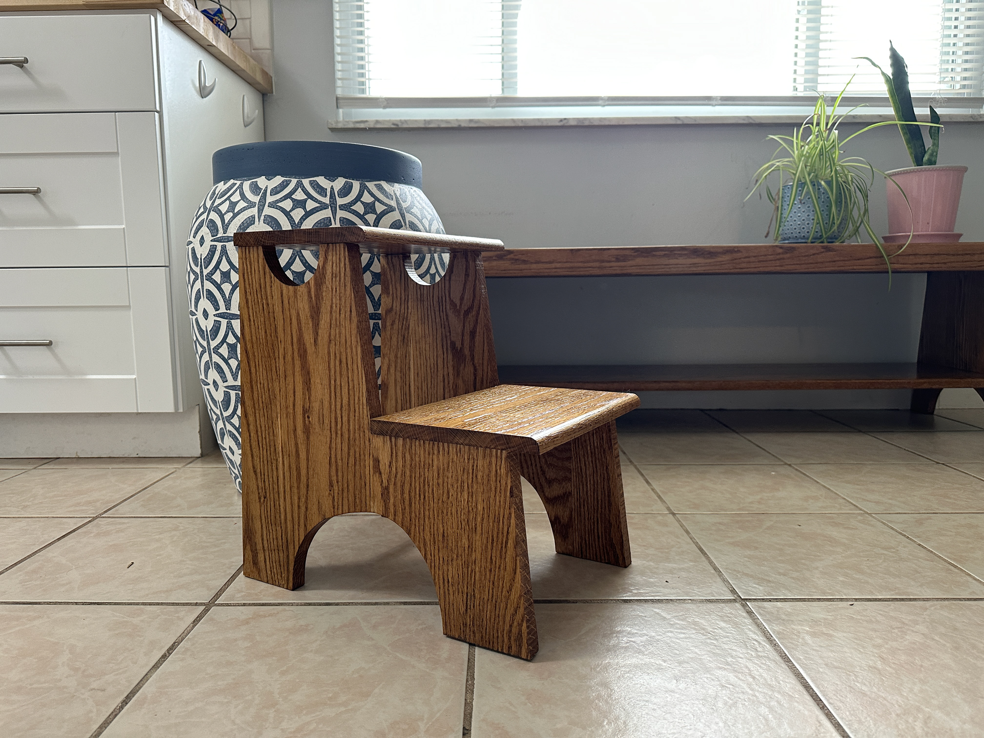 A mistake with a setting on the domino tool put holes directly through the stool's tread. The only way to fix this without buying new wood, or sacrificing the quality of my work was to shrink the width of the stool from 14" down to 11".